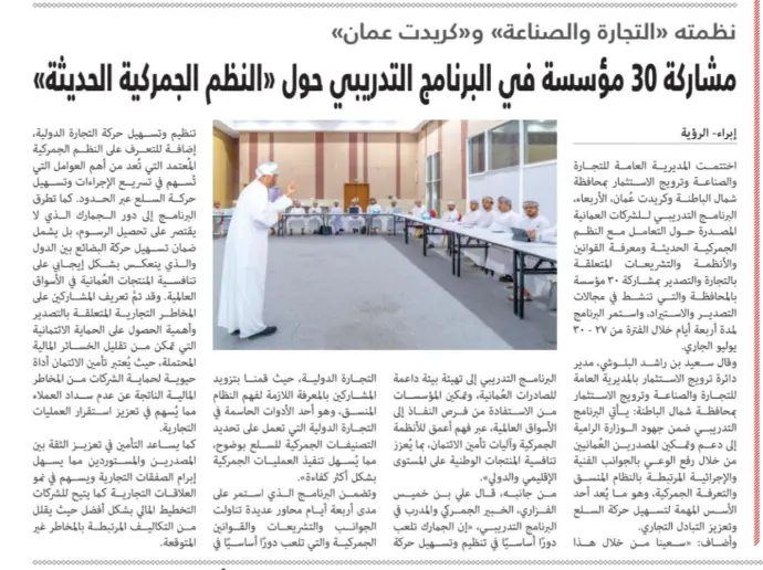 نظّمت وزارة التجارة والصناعة وترويج الاستثمار بالتعاون مع “كريدت عُمان” دورة الإجراءات والتعرفة الجمركية وعلاقتها بالضرائب والقيود على السلع،